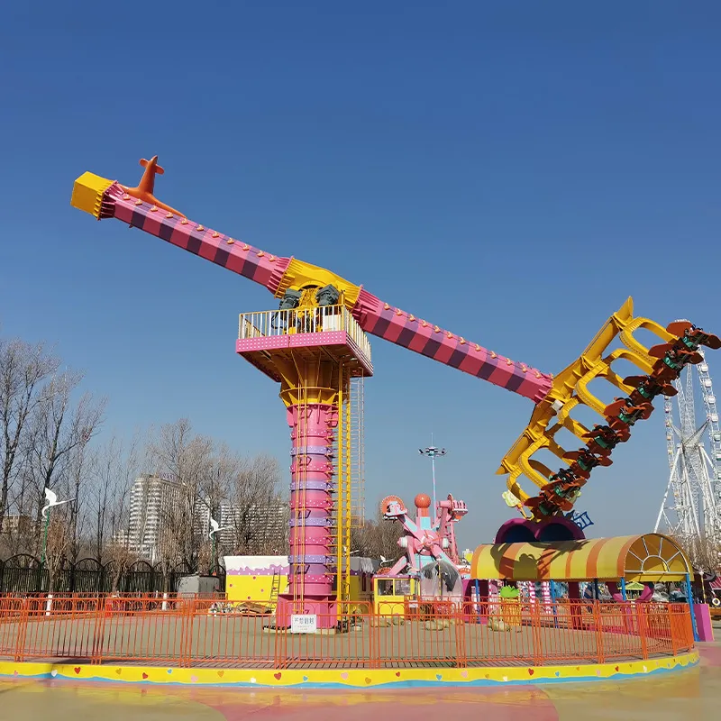 rotation. With the boom fixed, the hanger rotates along the center of gyration, and the passengers can realize the rotation of the seat at the end of the hanger by controlling the vibration amplitude of the flying wing. This equipment can make the passengers feel the new and exciting riding experience. The total height of the equipment is 20.5 meters, the running height is 21.2 meters, and the number of fully loaded passengers is 12.