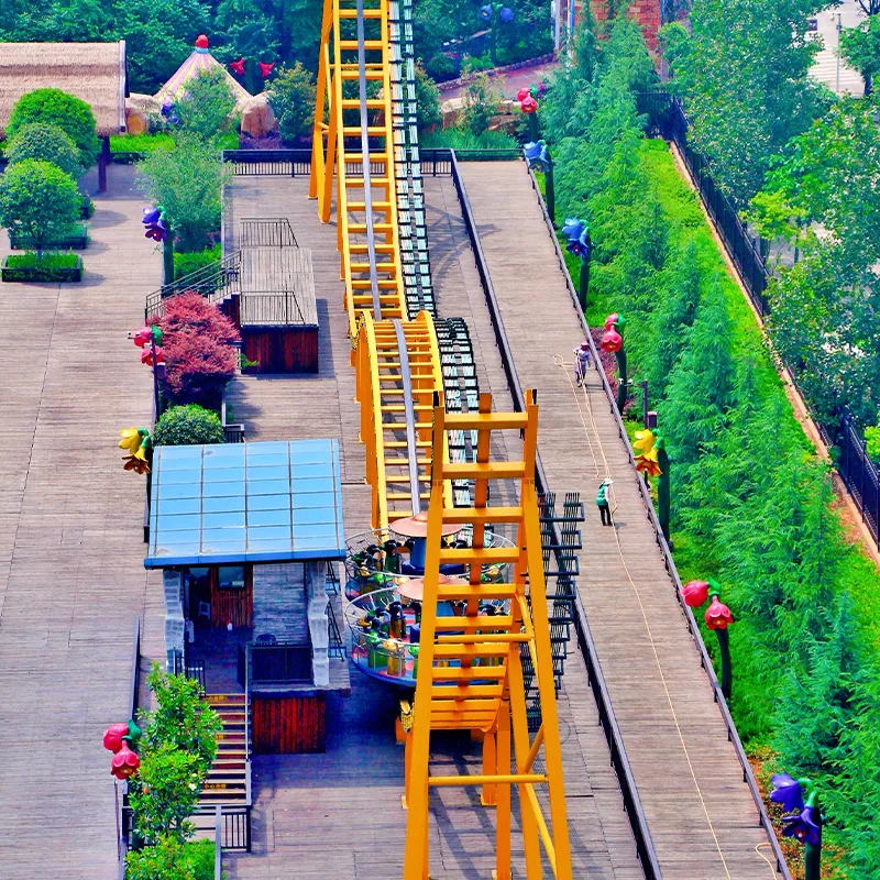 The cockpit is locked by mechanical mechanism, and the performance of the whole machine is stable, so that tourists can feel safe and comfortable while riding, and there is reliable safety guarantee. The equipment consists of columns, tracks, pulleys and electrical systems. The pulley consists of a seat, two turntables, a pulley frame, a gear train and a driving device. There are 16 people on each turntable and 32 passengers at a time. Passengers sit on the seat and rotate with the turntable. At the same time, the pulley is driven by the driving device to reach the top position after several cycles of reciprocating acceleration, and then slides back and forth along the W track. Finally, the turntable stops by energy consumption braking. The equipment occupies a long and narrow area and is convenient for planning.